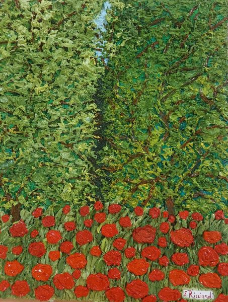 Alberi tra fiori in primo piano (olio su tela 50x70)